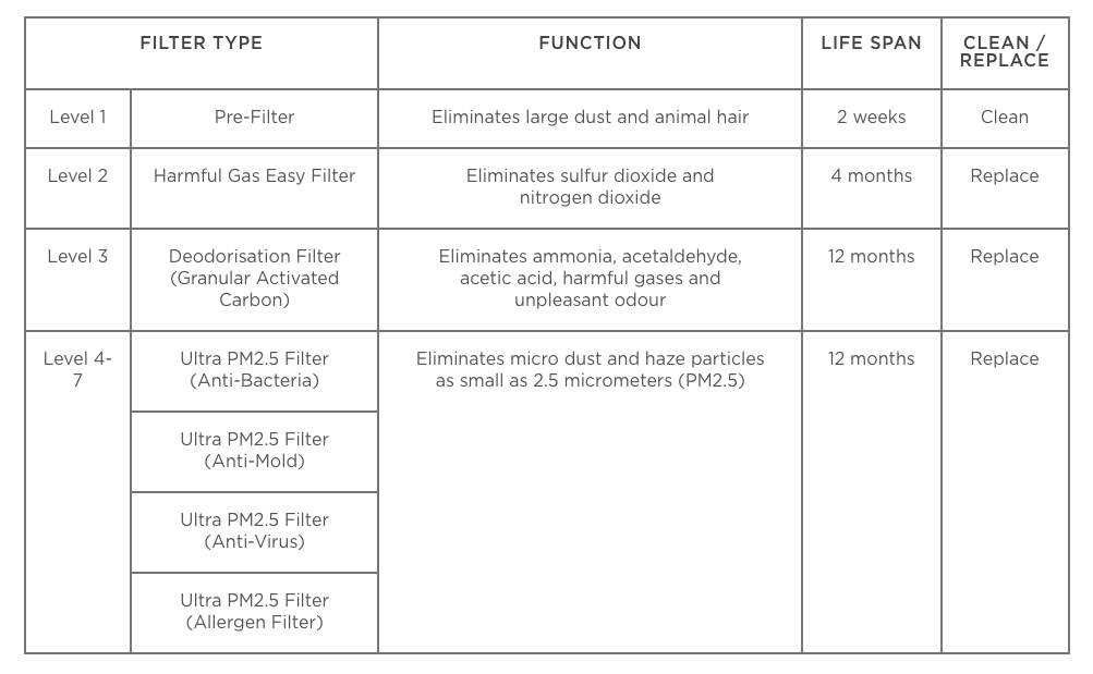 Through 7 stage filtration system, air is perfected through the removal of dust and bacteria in the air.