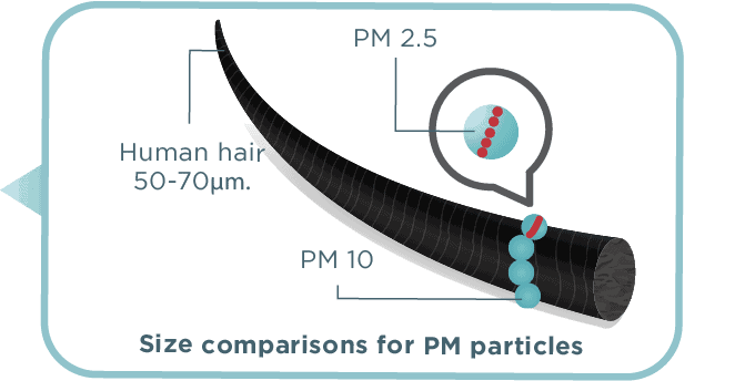 How small is PM2.5? Think about a single hair from your head. The largest fine particle is 30 times SMALLER than an average human hair (70 micrometers in diameter).
